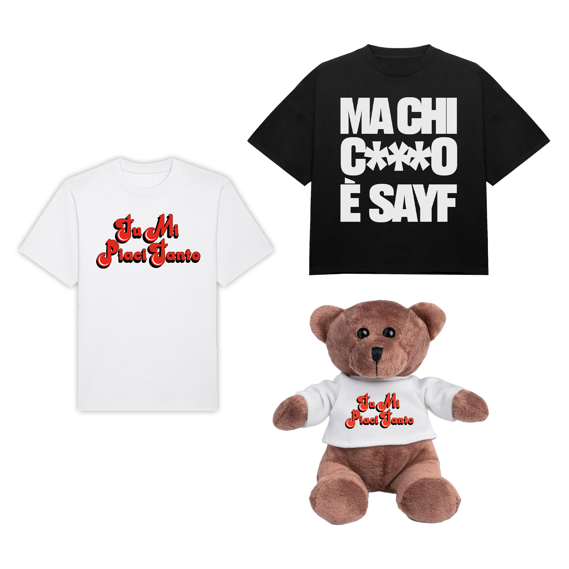 T-Shirt "MA CHI C***O È SAYF" + T-Shirt "TU MI PIACI TANTO" + Peluche "TU MI PIACI TANTO". Kit in pre-order.